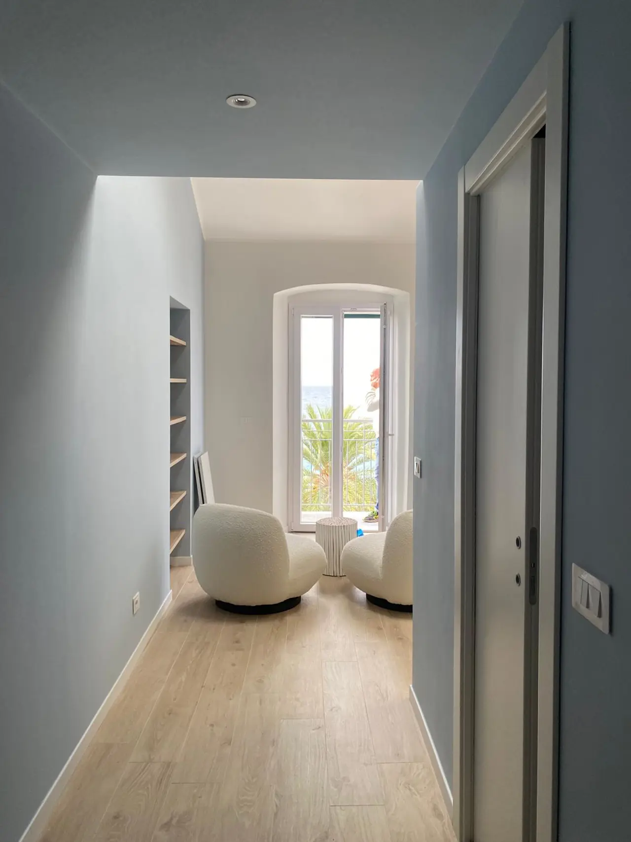 Oggi, l’appartamento di Ospedaletti si presenta come una seconda casa pienamente vissuta: ambienti fluidi, luce naturale valorizzata da superfici riflettenti, un’atmosfera contemporanea ma calda, pensata per accogliere momenti di relax in riva al mare.